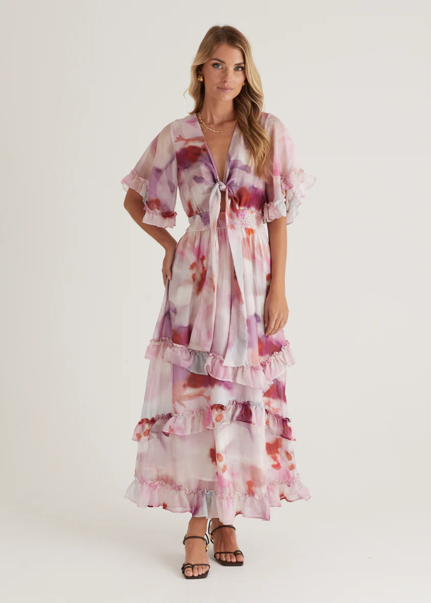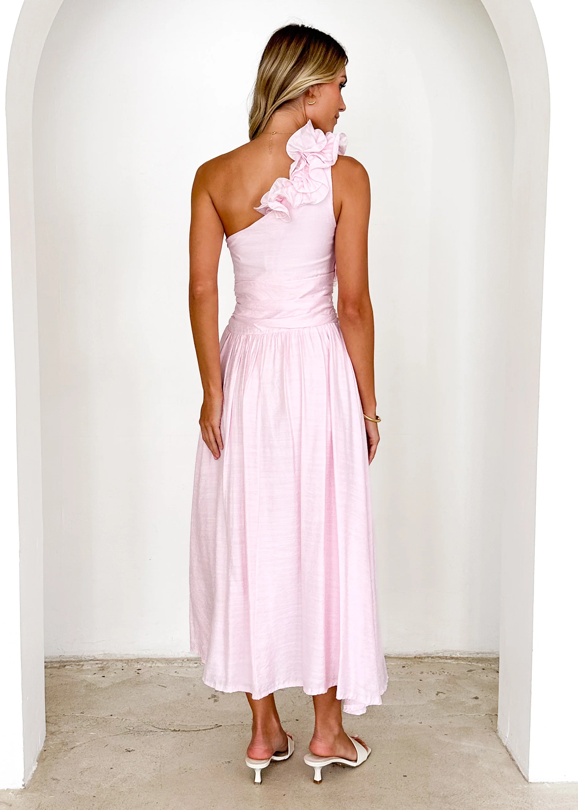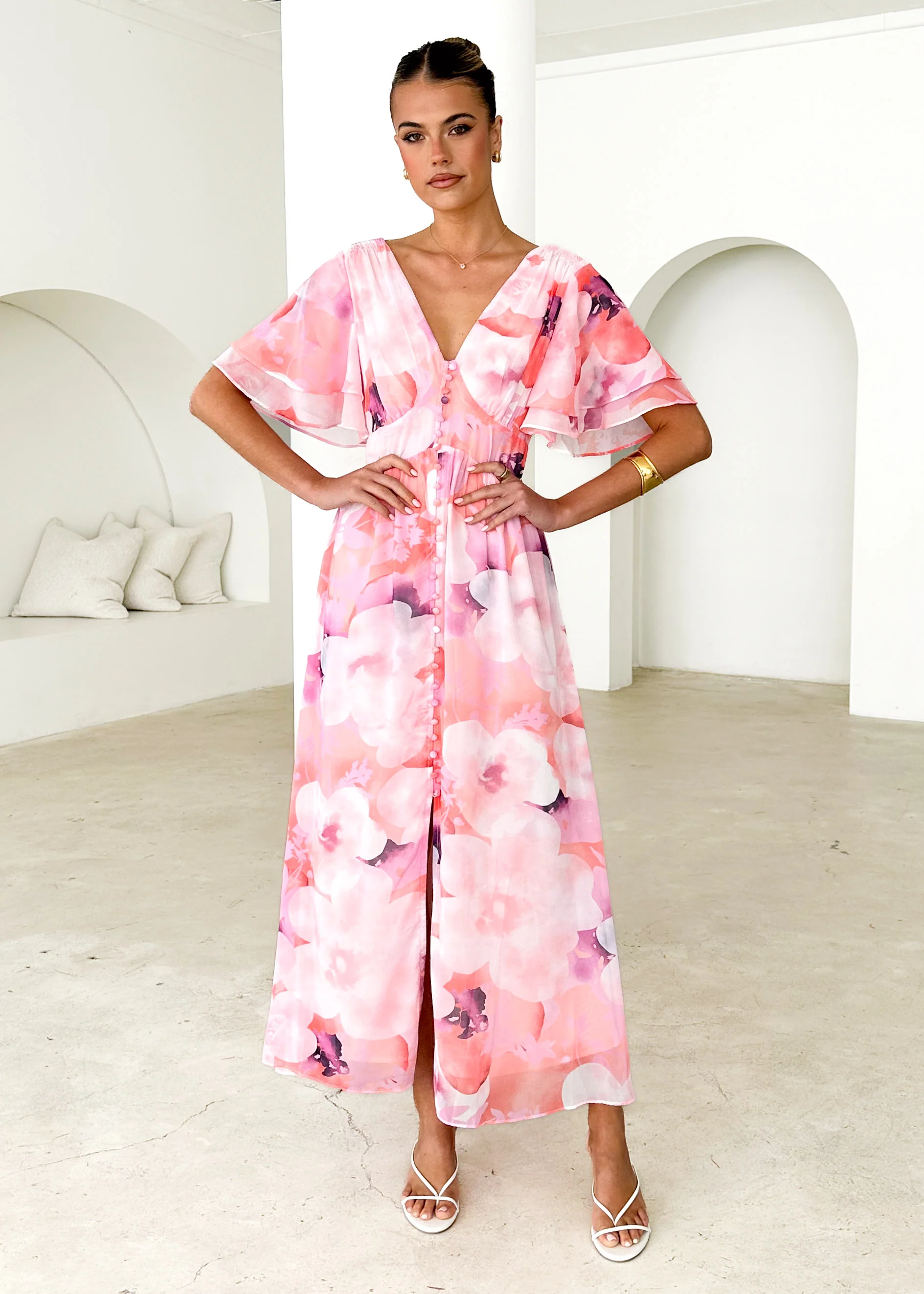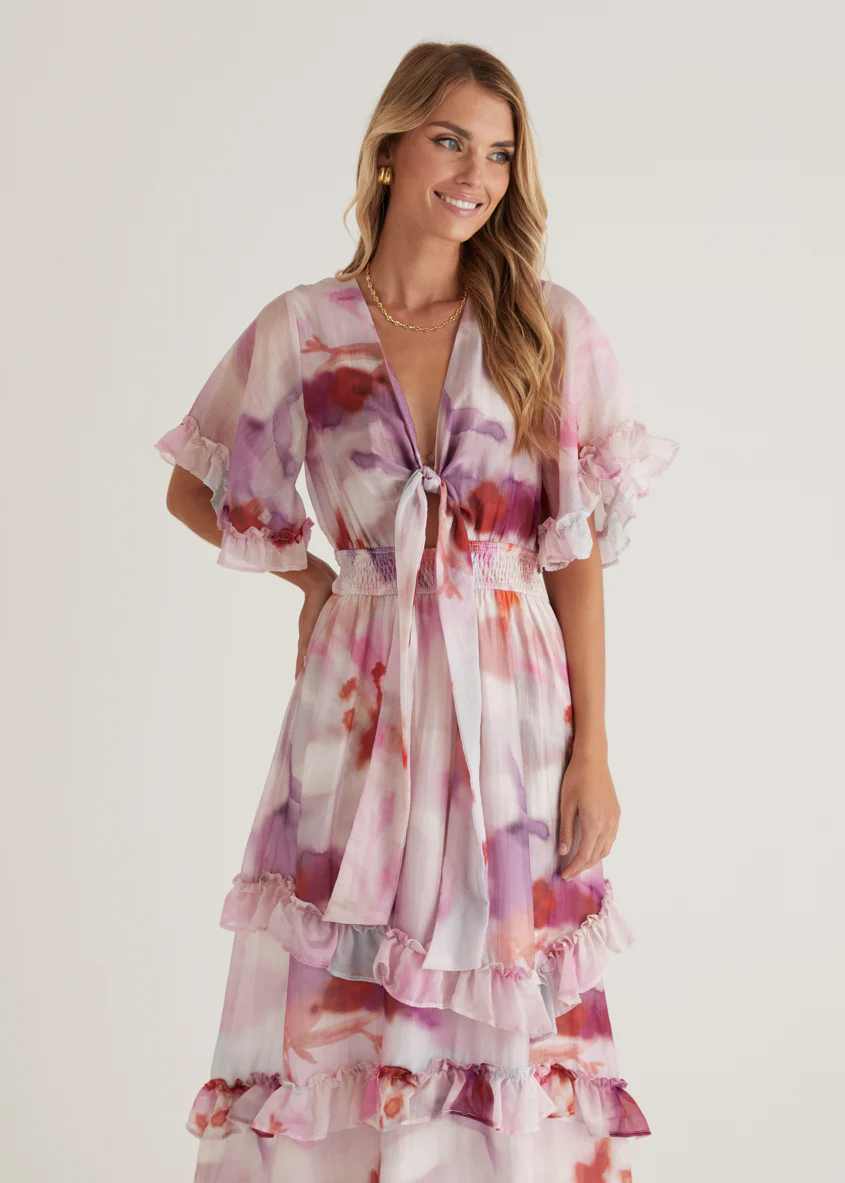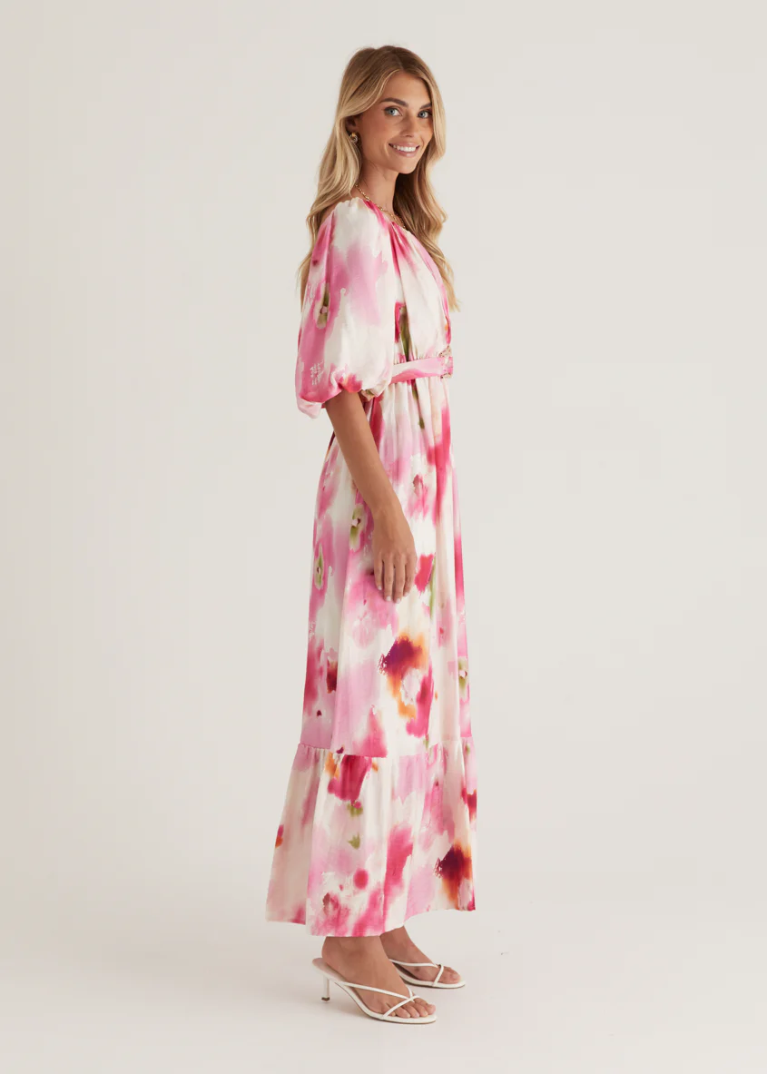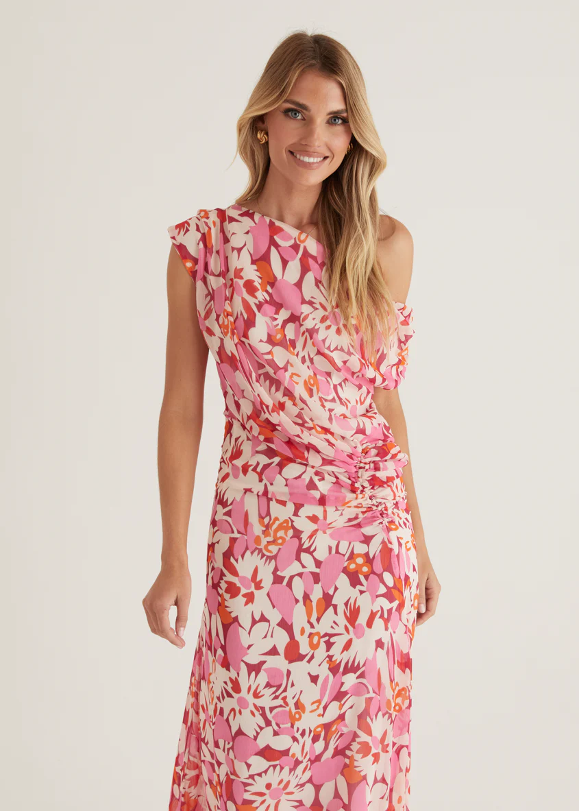 Halia Off Shoulder Midi Dress - Pink Watercolour