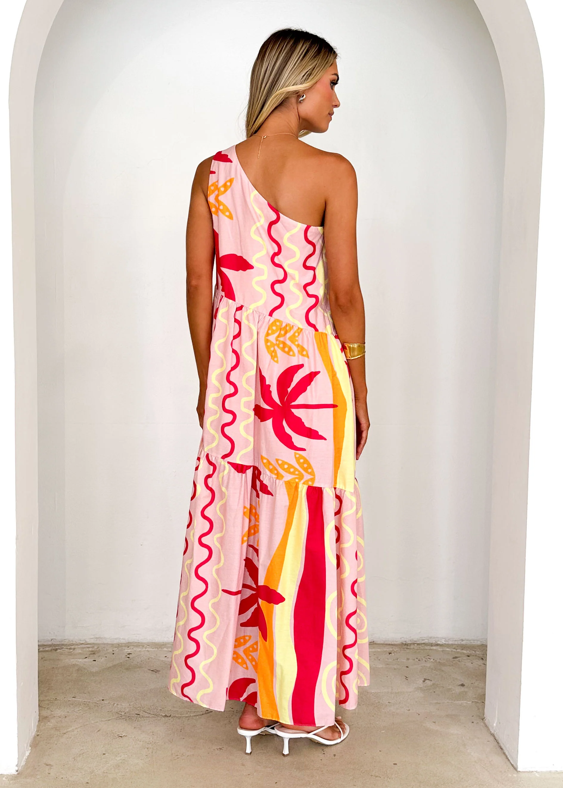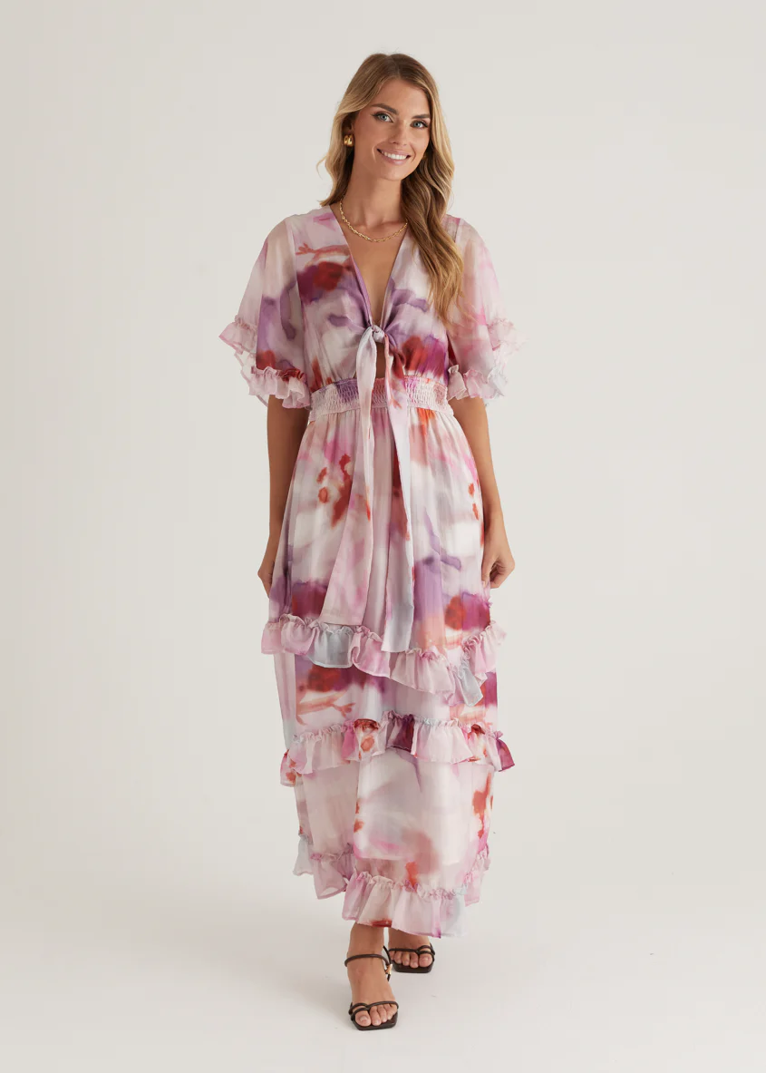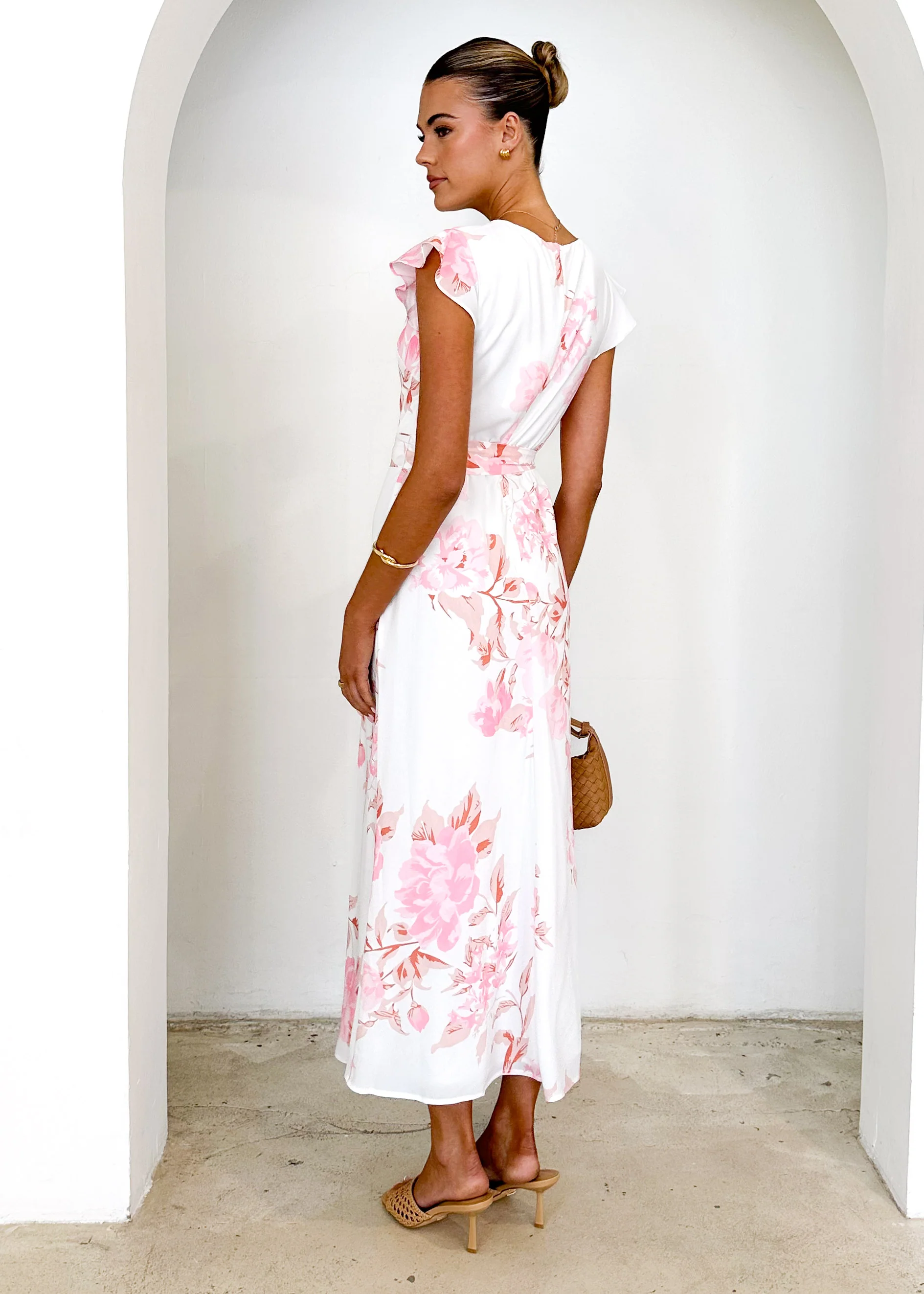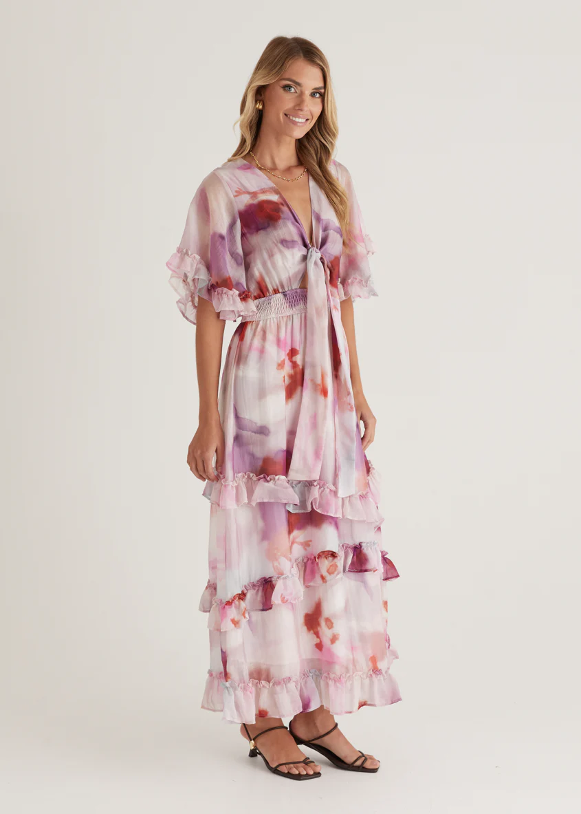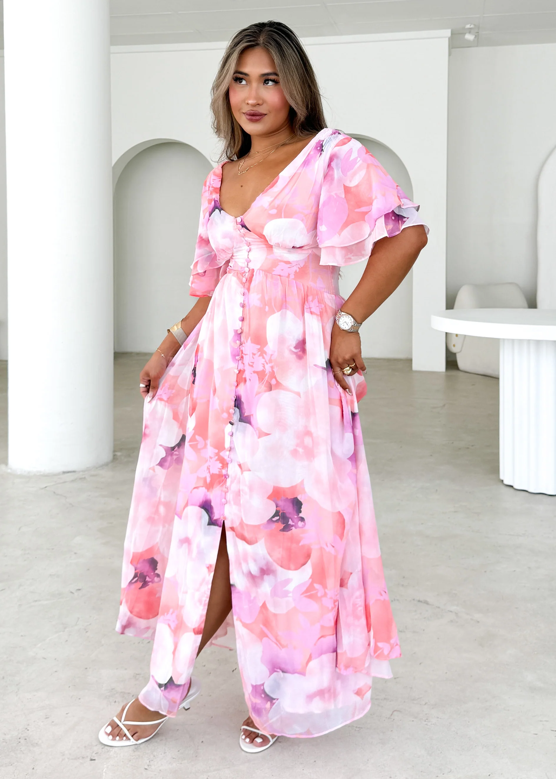 Halia Off Shoulder Midi Dress - Pink Watercolour