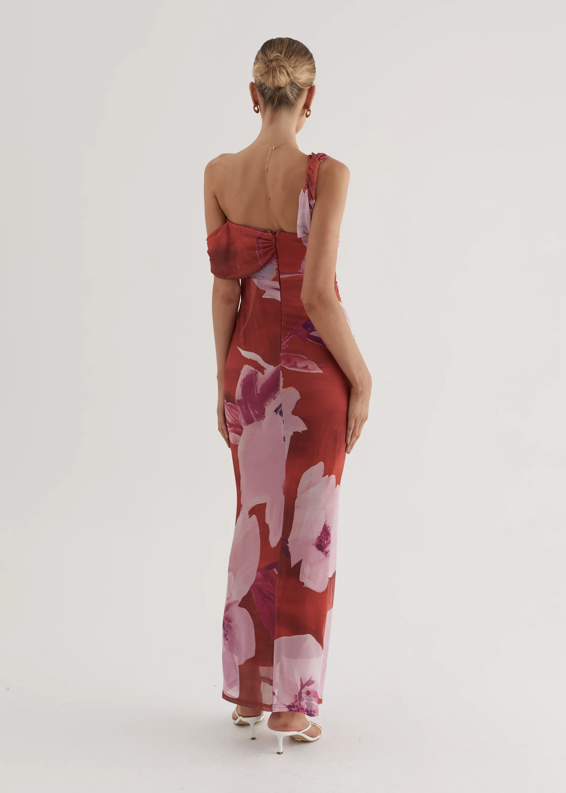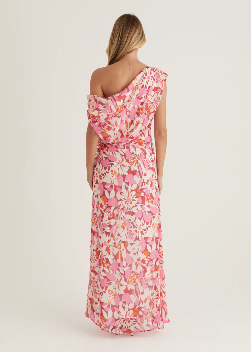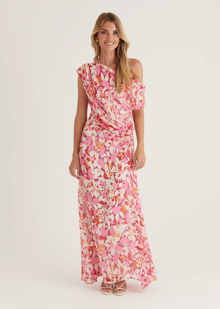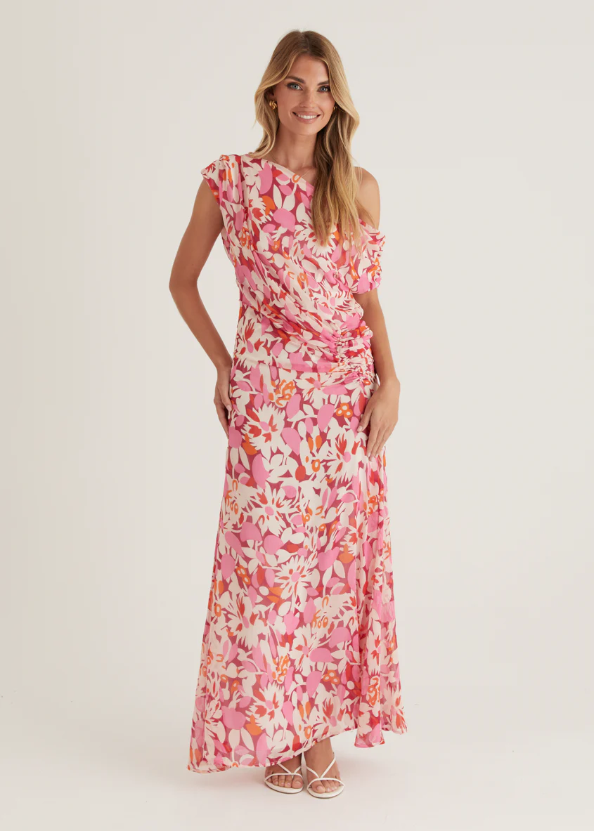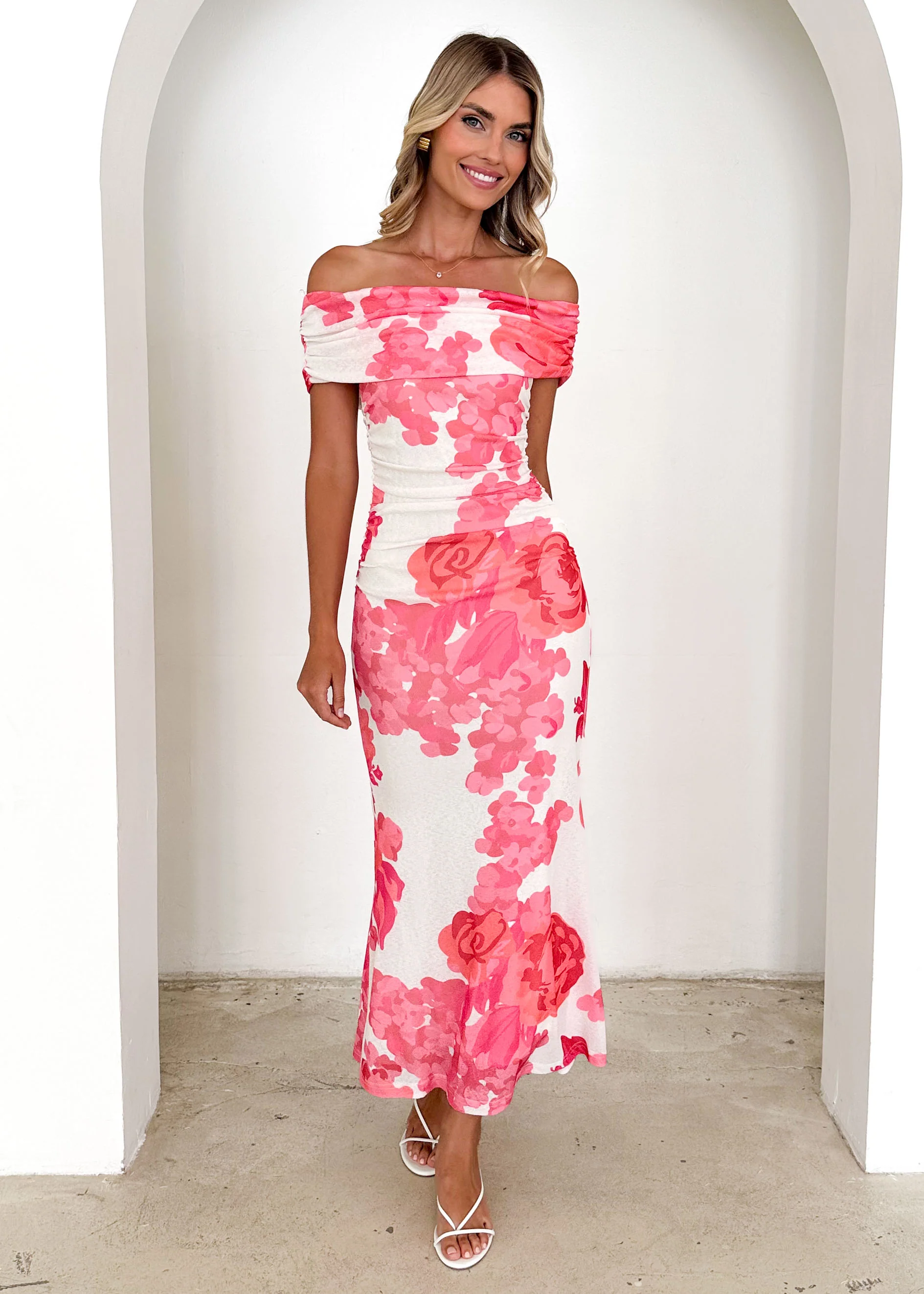 Iris Off Shoulder Mesh Maxi Dress - Hot Pink Floral