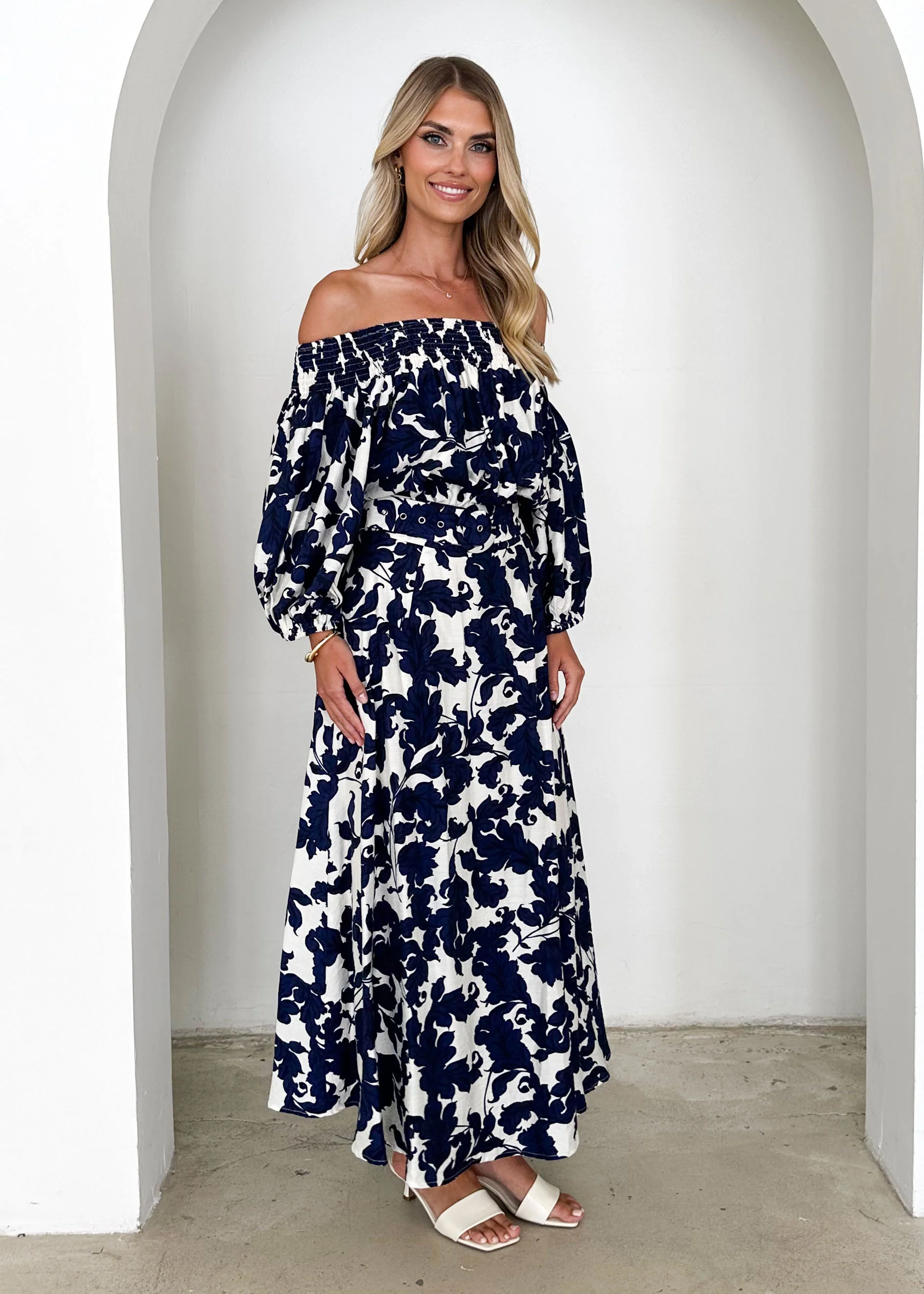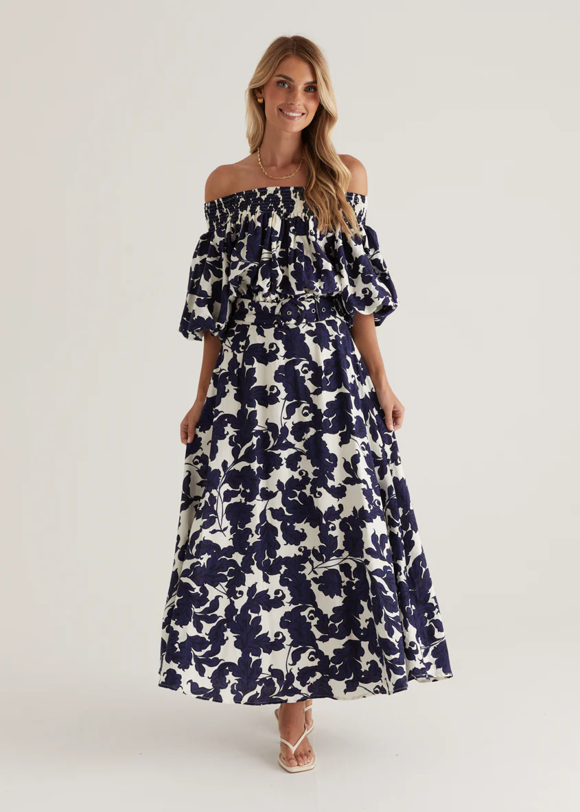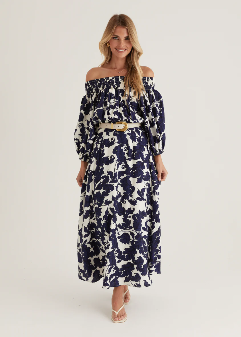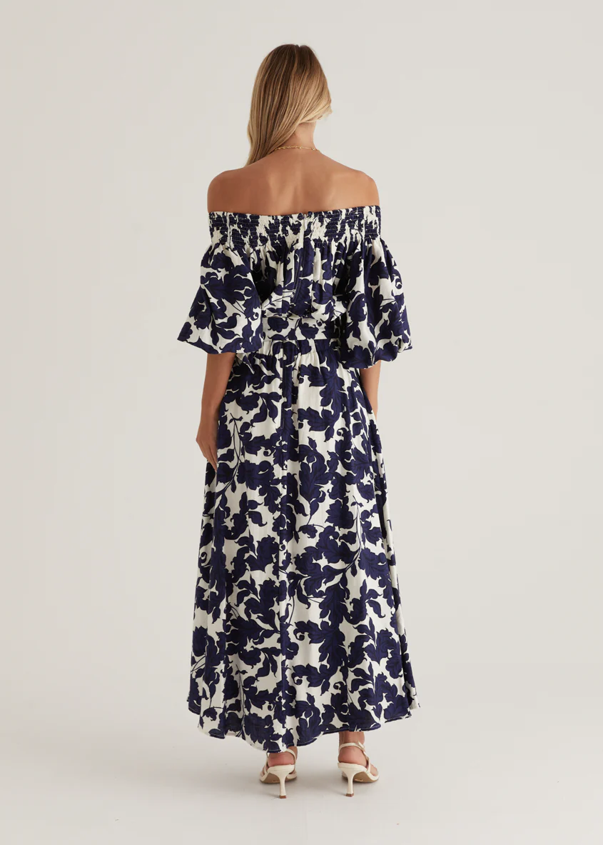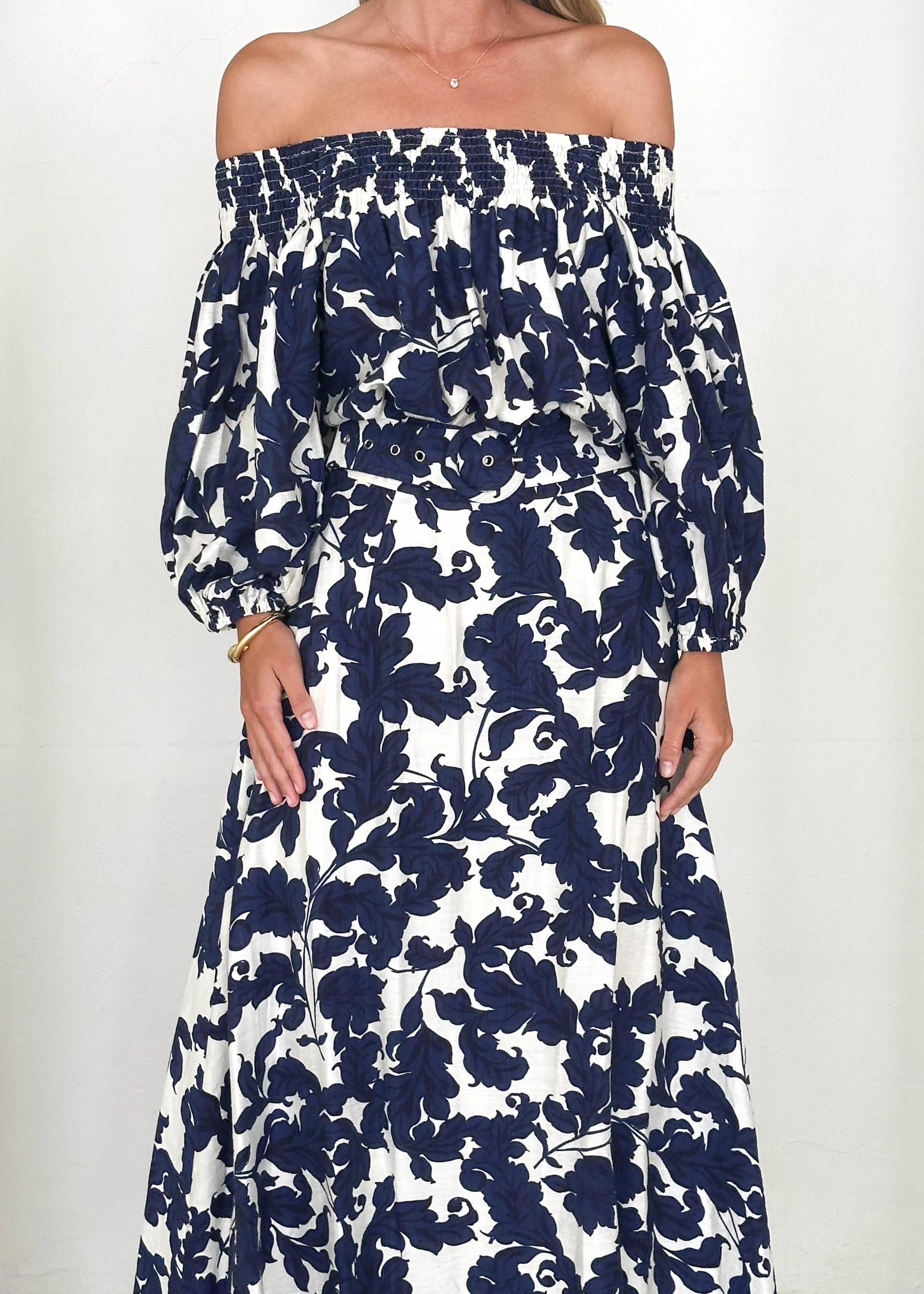 Talu Off Shoulder Midi Dress - Navy Paisley