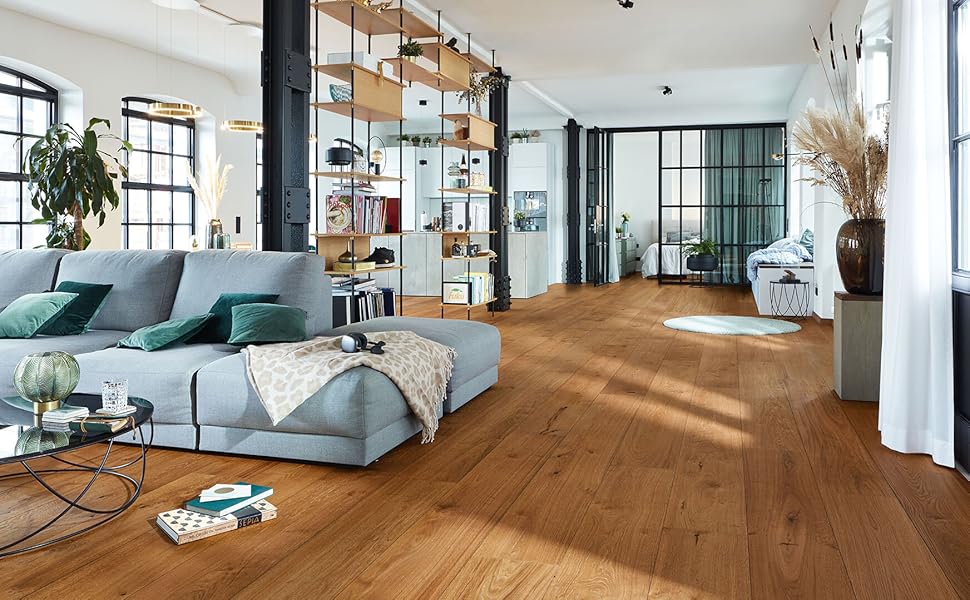 Il pavimento in legno Lindura di Meister è la rivoluzione del pavimento in legno! Un pavimento in legno come non è mai esistito. Robusto, sostenibile, in formato XXL o a spina di pesce E poiché è realizzato al 100% con tessuti naturali, indossa anche l'Angelo Blu. Il segreto risiede nell'innovativa tecnologia Wood-Powder, che trasforma un semplice pavimento in legno in un vero e proprio pavimento in legno high-tech. La polvere di legno, una miscela di materiali di fibre di legno fine, componenti minerali e altri additivi naturali, viene fusa saldamente insieme con uno strato di copertura in vero legno, un rivestimento in HDF e un cambio sotto pressione e calore. In questo modo si crea un pavimento in vero legno naturale ma particolarmente resistente, che perdona molti carichi ed è assolutamente adatto all'uso quotidiano.