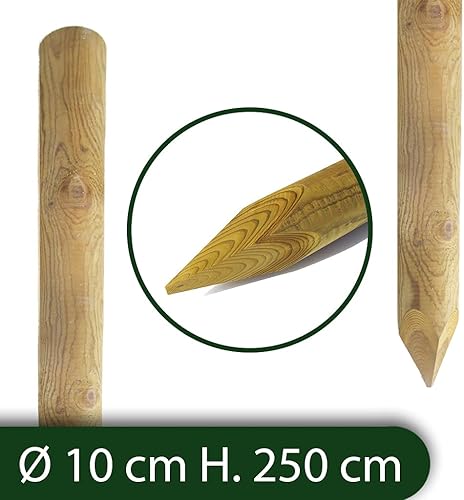 1 PZ Pali in Legno Ø CM 10 Altezza CM 250 H TONDI con Punta TRATTATI IMPREGNATI per Recinzione STACCIONATA/STECCATO PALO Tondo