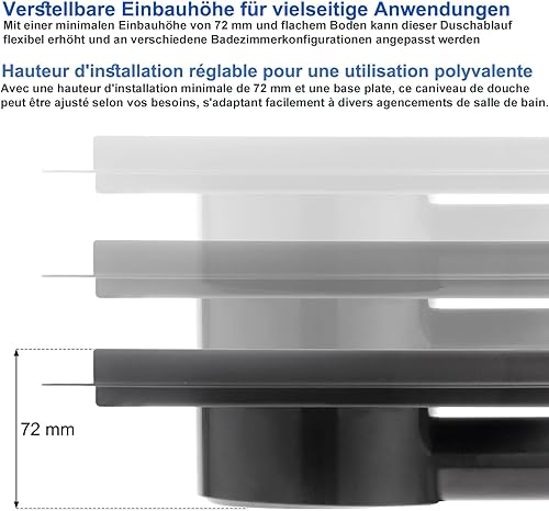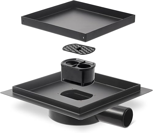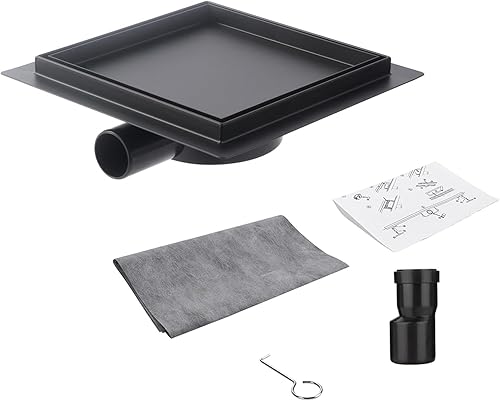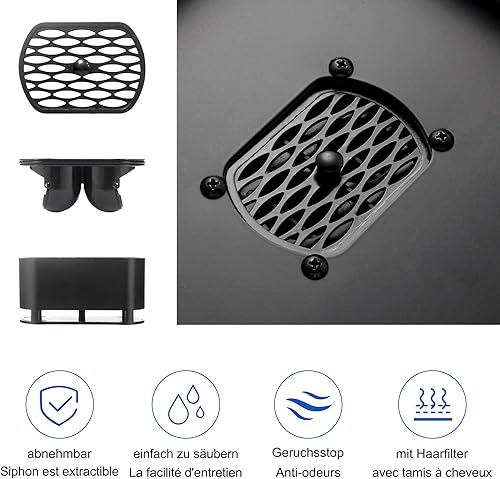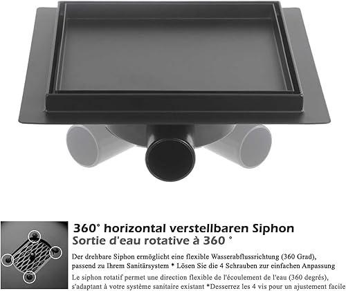 Scarico per doccia quadrato, 20 x 20 cm, in acciaio inox, piastrellabile, sifone con filtro per capelli e tappo antiodore, girevole a 360° per docce a pavimento