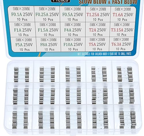 AUKENIEN 150 Pezzi Fusibili Vetro 9 Valori Fusione Rapida F 0,1A 0,25A 0,5A 1A 1,5A 4A 5A 8A 10A 6 Valori Soffiato Lento T 1,25A 1,6A 2A 3,15A 5A 6,3A Ampere 250V 5x20mm Kit Assortimento di Fusibile