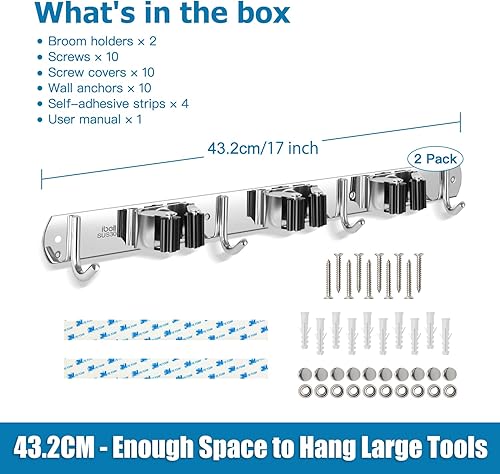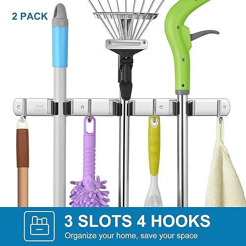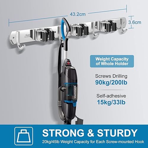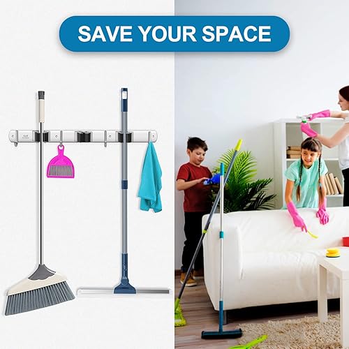 Portascopa e Portaspazzole Da Muro, Portascope da Muro Appendi in Acciaio Inossidabile con 3 Posti e 4 Ganci, Supporto Parete Autoadesivo per Scopa e Porta Utensili per Giardino, Garage
