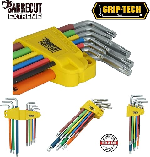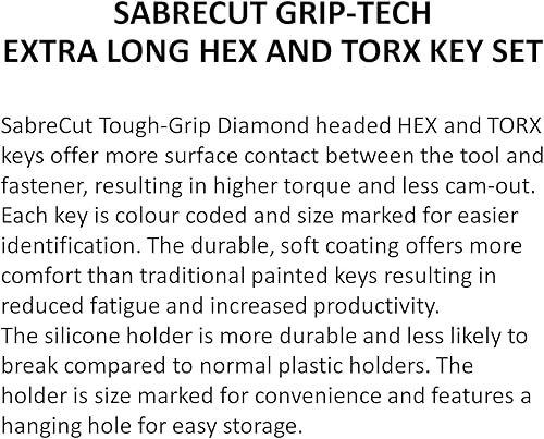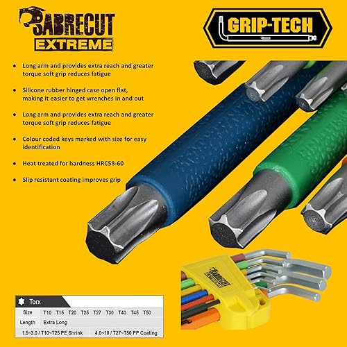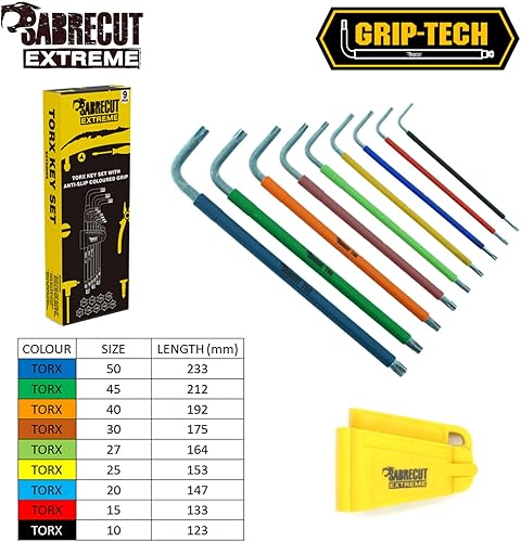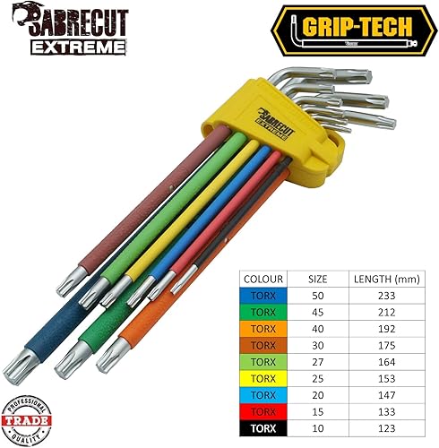 9 pezzi SabreCut SCTX009S Set di chiavi Torx extra lunghe con impugnatura morbida con codifica a colori - Taglie T10-T50
